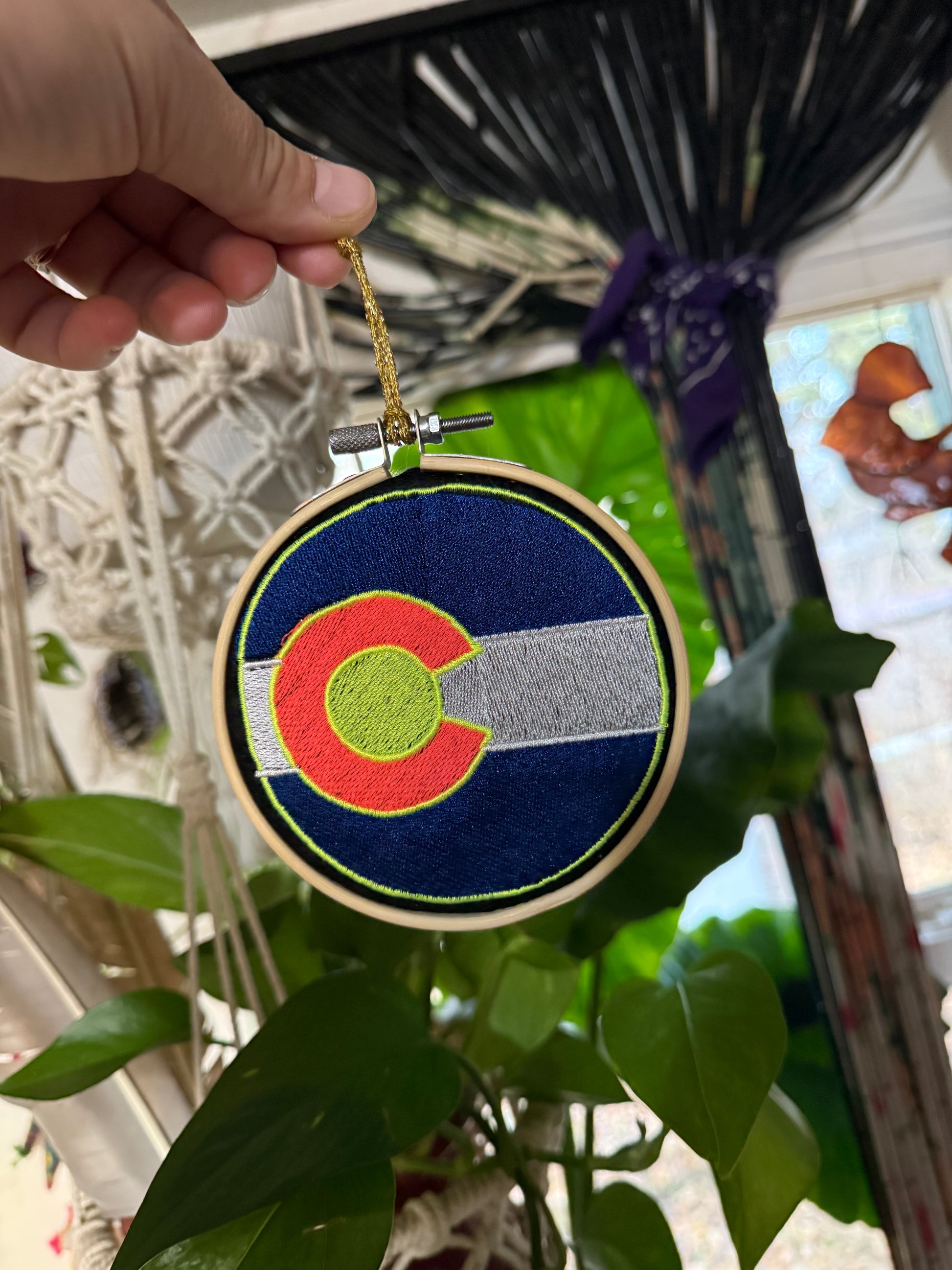 Embroidered Colorado flag ornament, glows under black light. 4” diameter, made in Colorado.