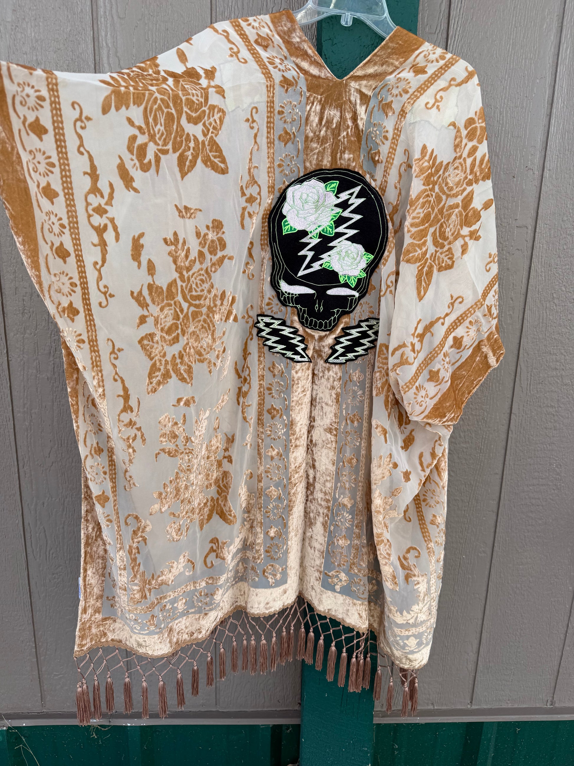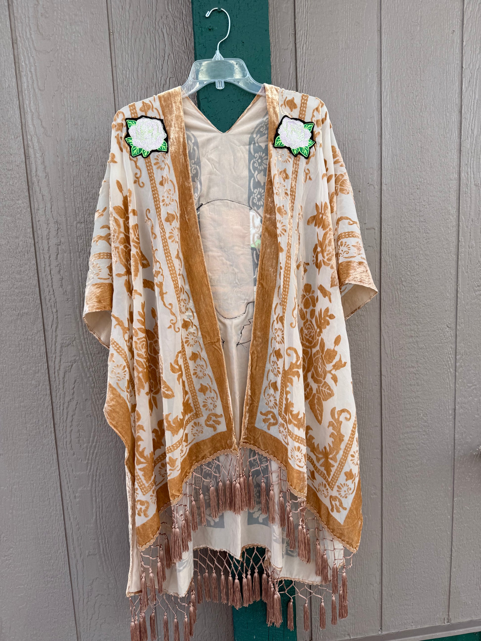 Velvet burnout fringe kimono with appliquéd embrodiered design.