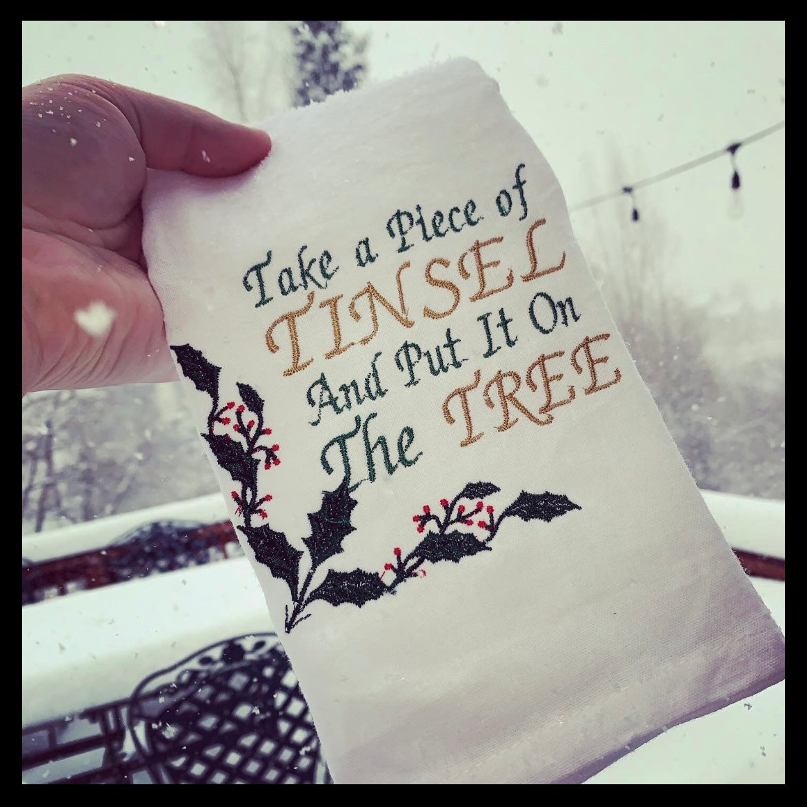 Embroidered tea towel with lyrics from 'Roses are Free' by Ween.