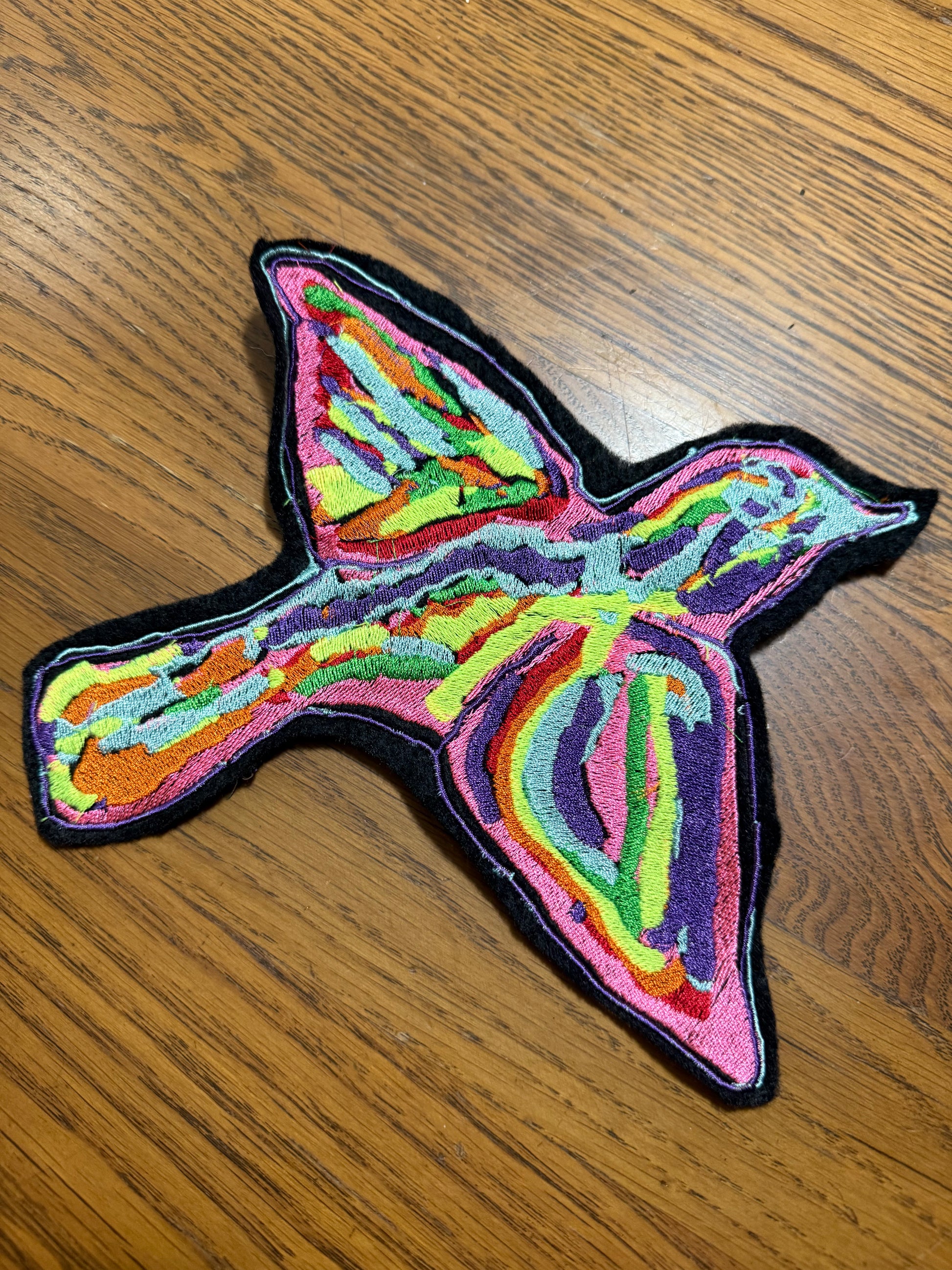 9”x9” embroidered panic sparrow patch. Kiss the mountain air we breathe.