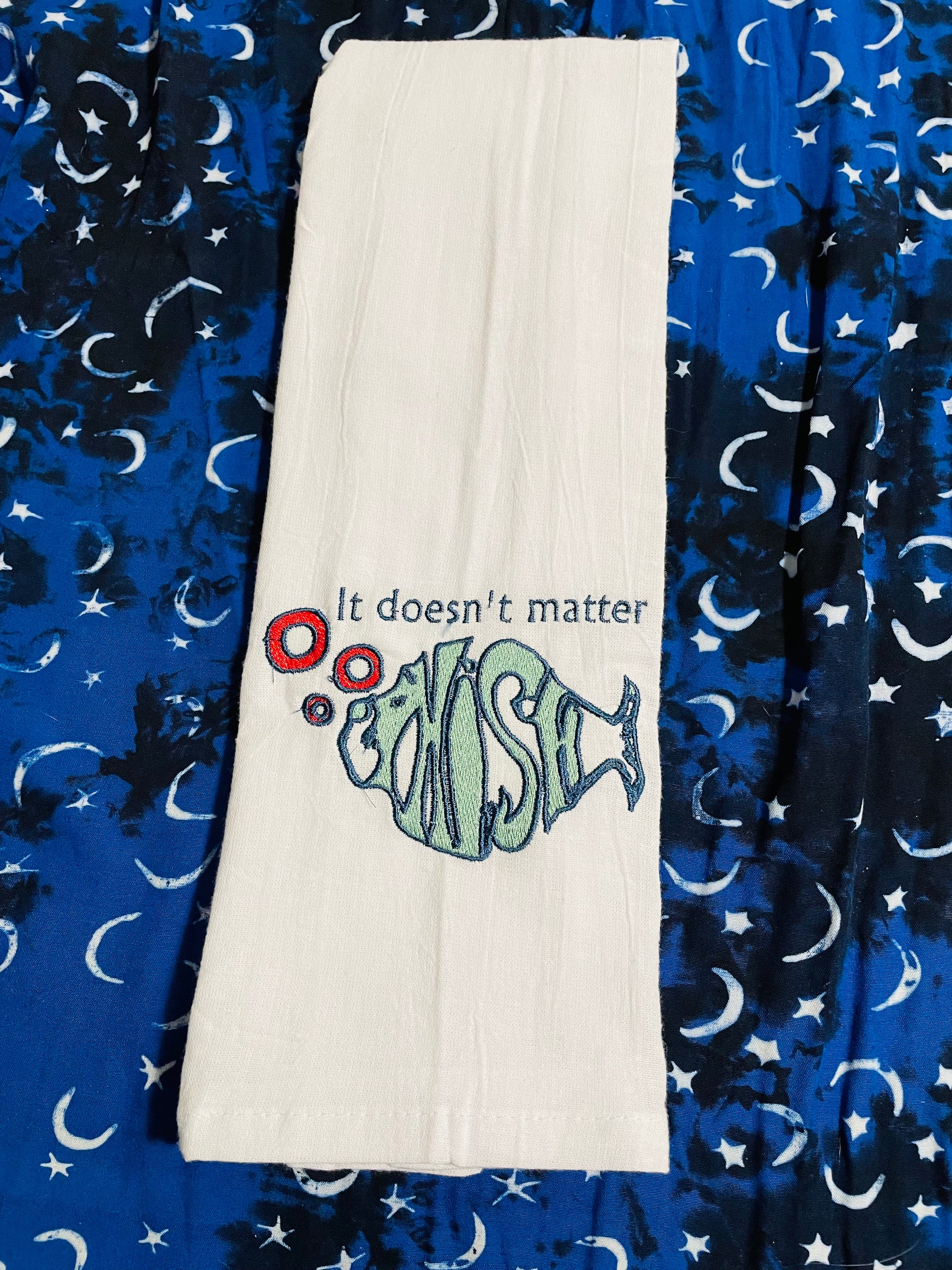 Phish tea towel with lyrics from 'Bug'.