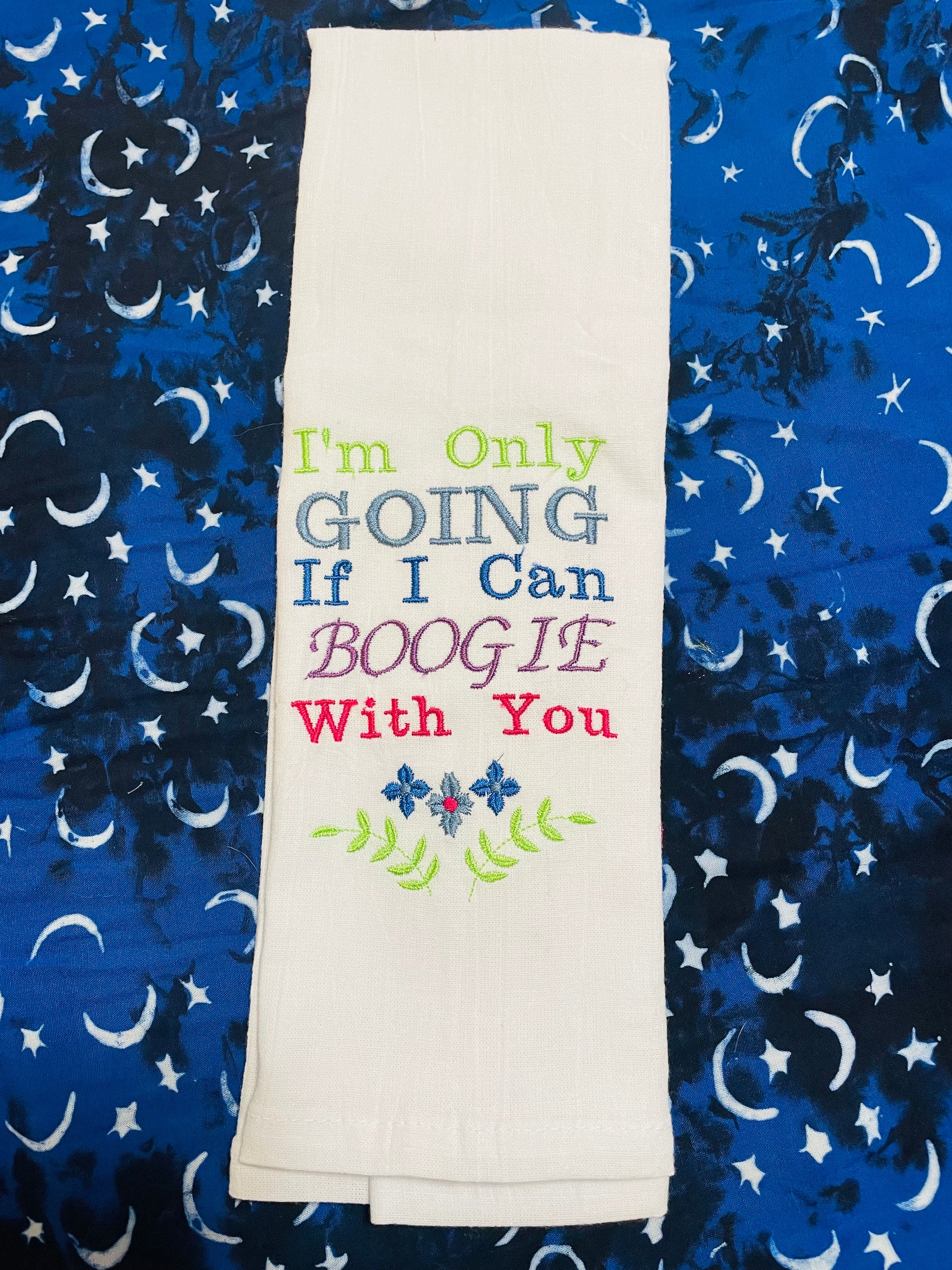 Embroidered tea towel with lyrics from Widespread Panic's 'Walkin' For Your Love'.